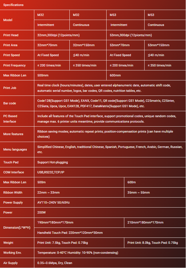 Print Area | 32mm*70mm | 32mm*150mm | 53mm*70mm | 53mm*150mm | |
